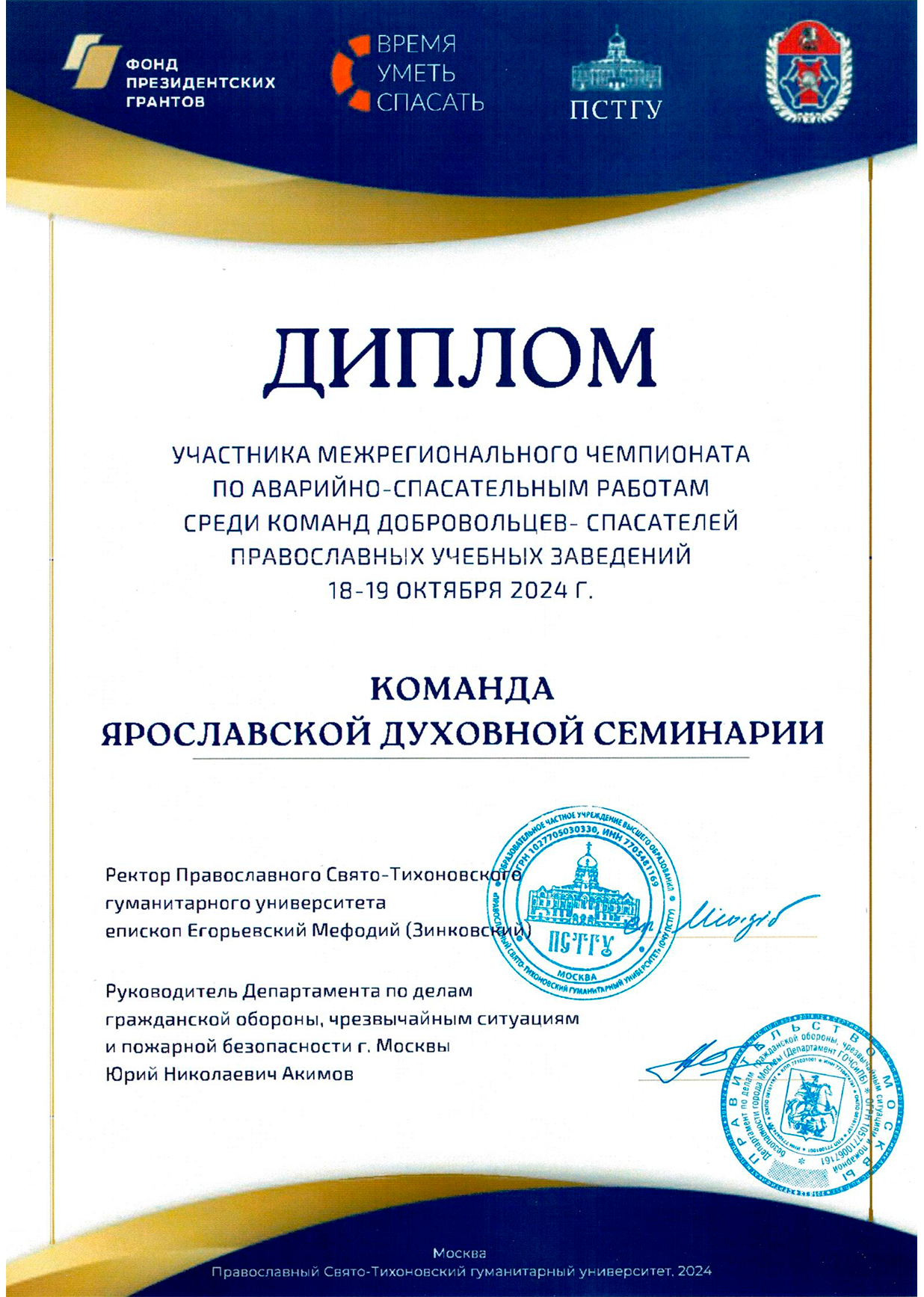 Диплом участника межрегионального чемпионата по аварийно-спасательным работам среди команд добровольцев- спасателей православных учебных заведений 18-19 октября 2024 г.