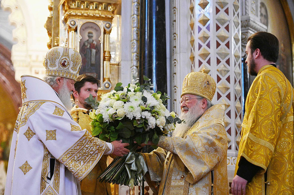 По окончании Литургии митрополит Крутицкий и Коломенский Ювеналий огласил поздравительный адрес Священного Синода Русской Православной Церкви и вручил Святейшему Владыке параман и букет белых роз.