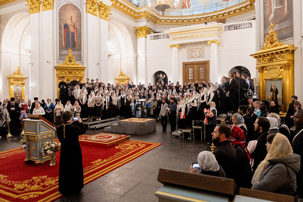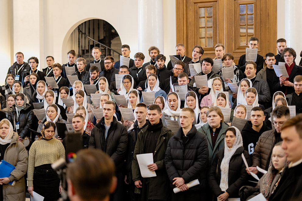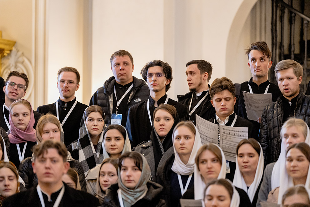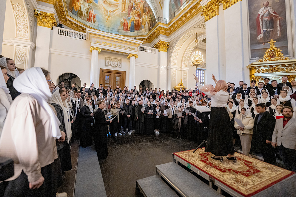 Песнопения исполнил сводный хор участников фестиваля под управлением лауреата международных конкурсов, преподавателя факультета церковных искусств и регента смешанного хора Санкт-Петербургской духовной академии Раисы Геннадьевны Гундяевой.