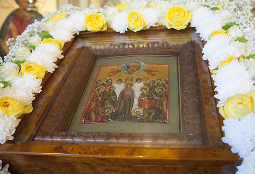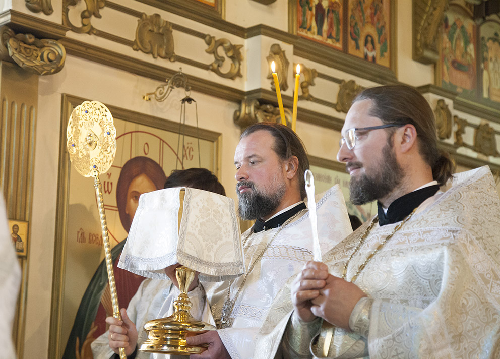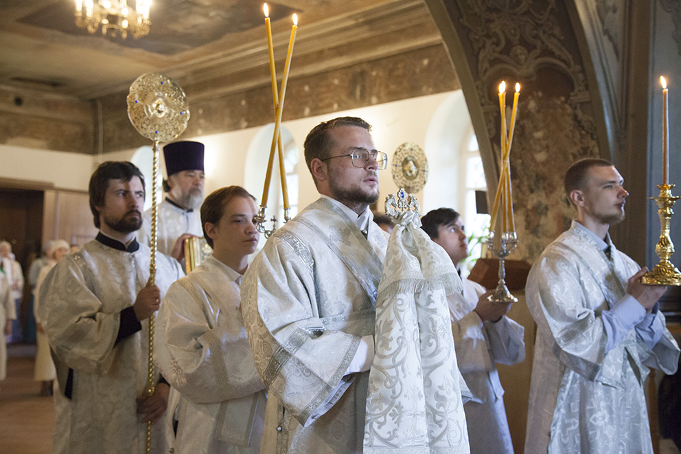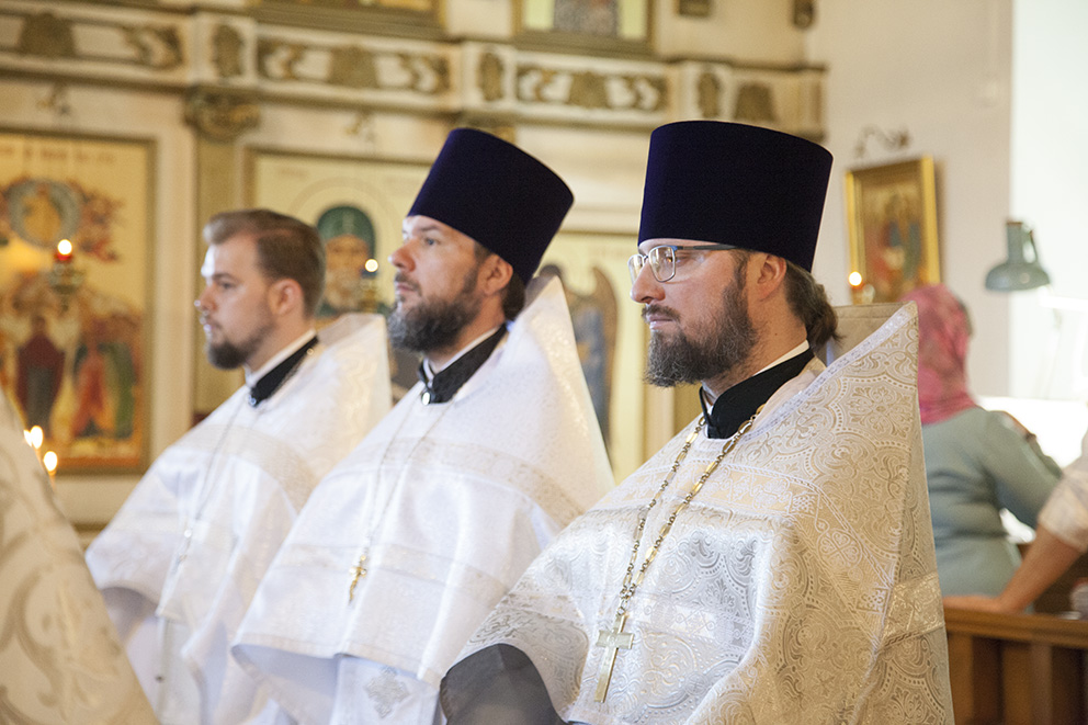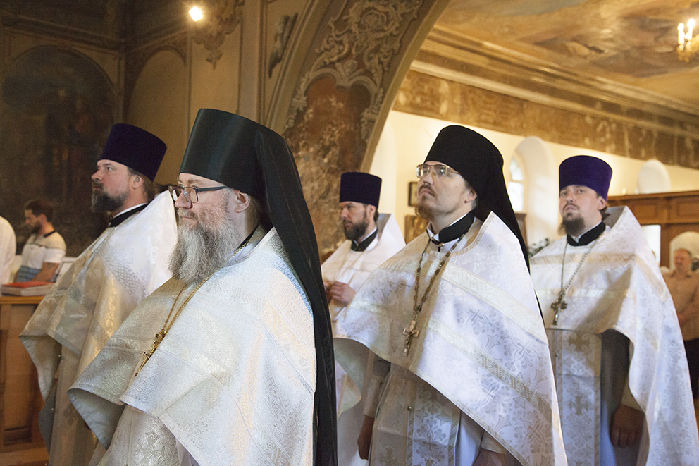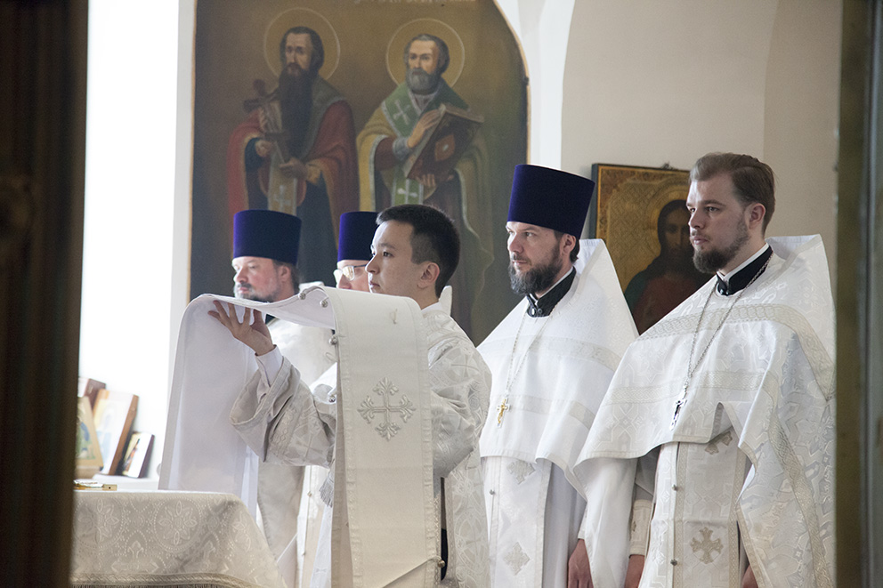 За Литургией владыке сослужили: благочинный приходов Центрального округа г. Ярославля протоиерей Олег Косолапов, настоятель храма и руководитель Отдела по взаимодействию с медицинскими учреждениями иеромонах Агафангел (Шкуранков), ректор Ярославской духовной семинарии иеромонах Платон (Кудласевич), настоятель храма Ярослава Мудрого г. Ярославля иерей Алексий Карпов, клирик Успенского кафедрального собора г. Ярославля иерей Дионисий Цыбуляк, клирик Успенского кафедрального собора г. Ярославля иерей Димитрий Пчелкин, клирик Вознесенско-Благовещенского прихода г. Ярославля иерей Давид Китчатов, протодиакон Захария Лунгу, протодиакон Вадим Медведев. Владыке митрополиту и священнослужителям помогали воспитанники семинарии.