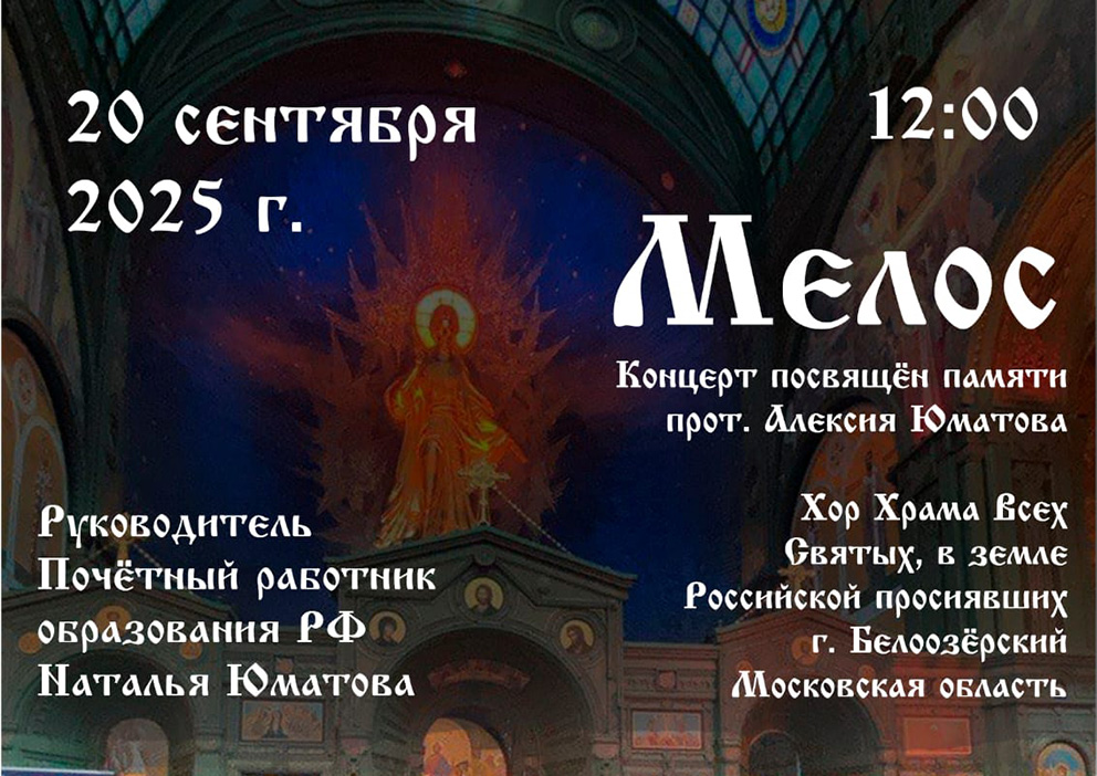20 сентября 2025 года в Богоявленском храме г. Ярославля пройдет творческая встреча-концерт с хоровым коллективом «Мелос» храма Всех святых, в земле Российской просиявших г. Белоозёрский Московской области.