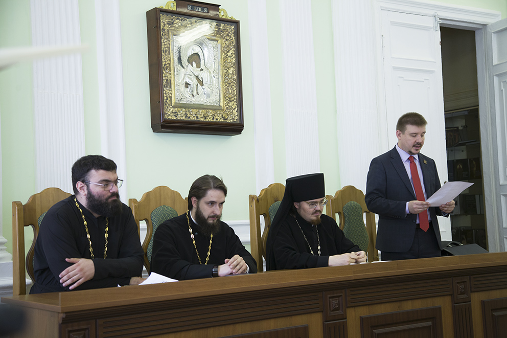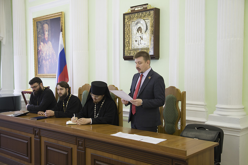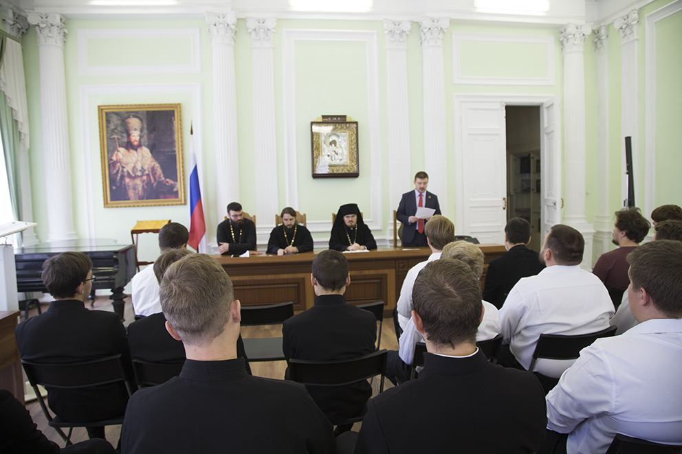 Проректор по учебной работе Д. А. Андрианов озвучил поздравление Святейшего Патриарха Московского и Всея Руси Кирилла ректорам, преподавателям, наставникам и студентам духовных учебных заведений с началом нового учебного года, а также приветственные адреса, поступившие в адрес семинарии от правящих архиереев епархий и ректоров духовных школ.