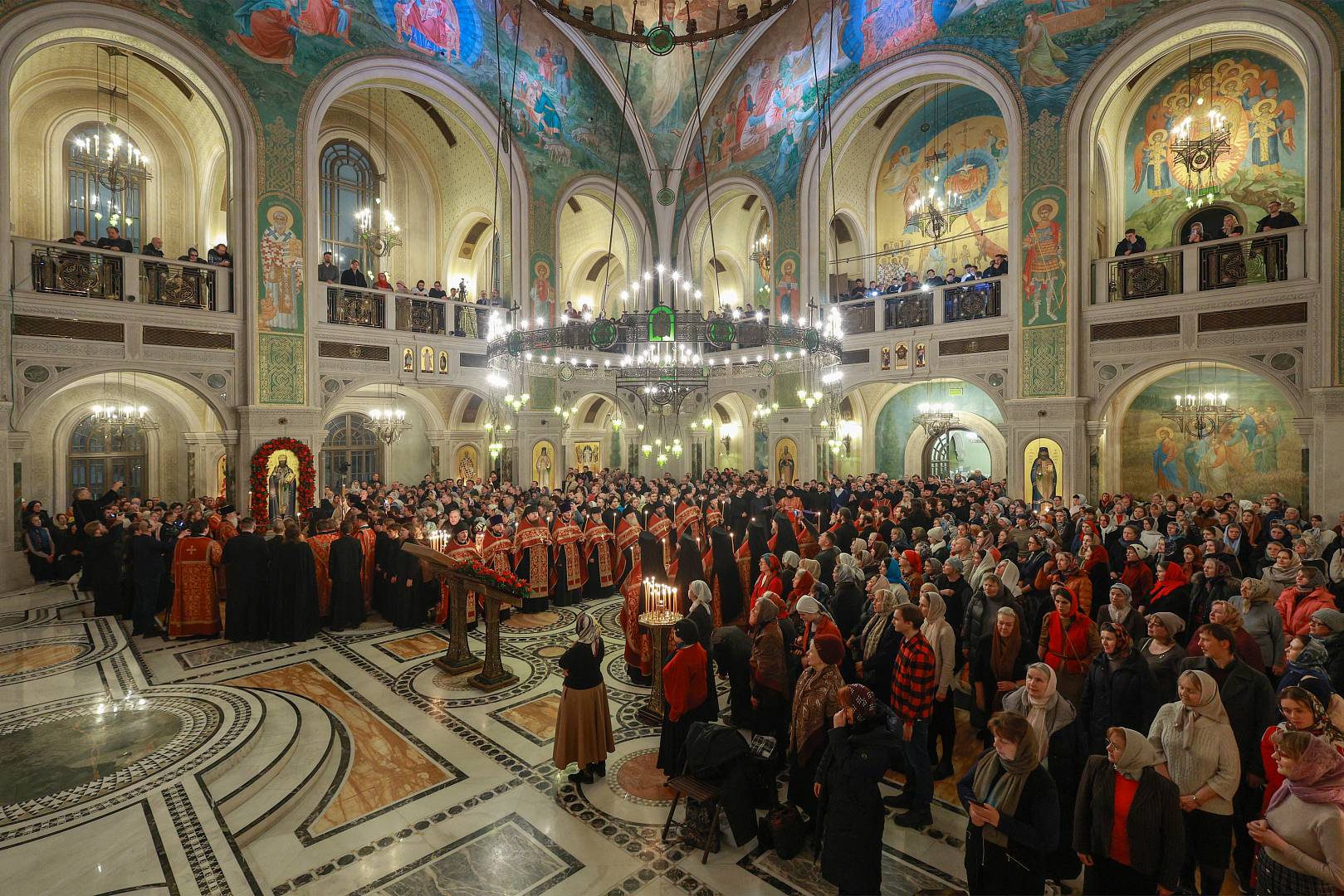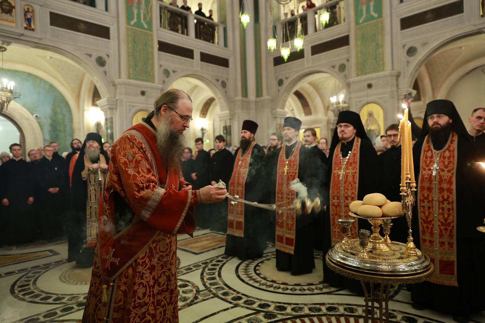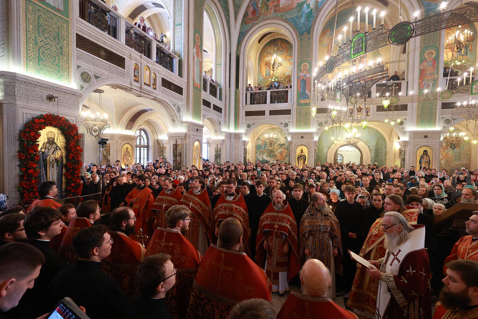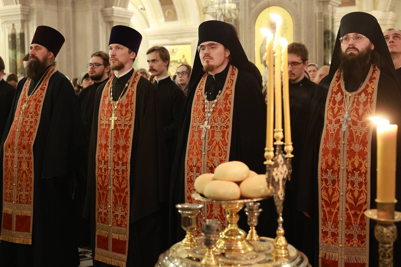 Всенощное бдение в храме Воскресения Христова и Новомучеников и исповедников Церкви Русской возглавил ректор Академии и наместник Сретенского монастыря игумен Иоанн (Лудищев). Ему сослужили выпускники в священном сане, студенты Академии, братия Сретенской обители и приглашенное духовенство.