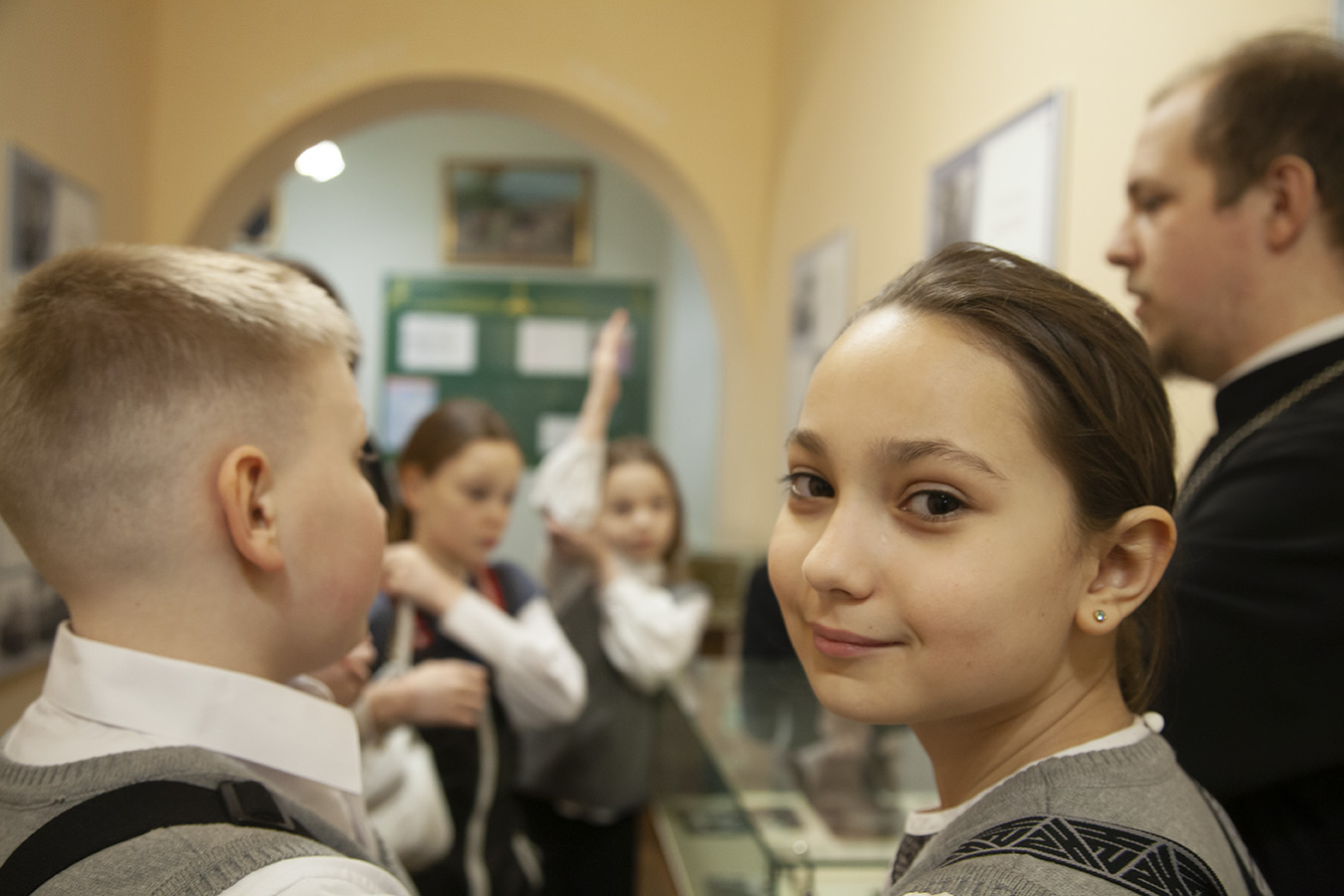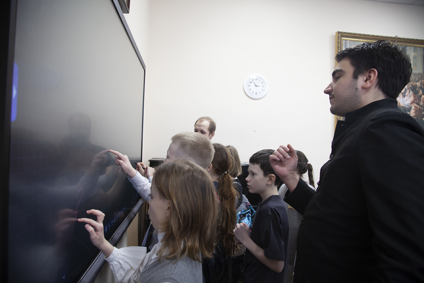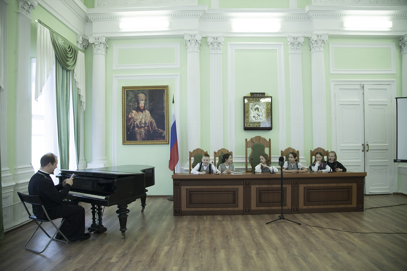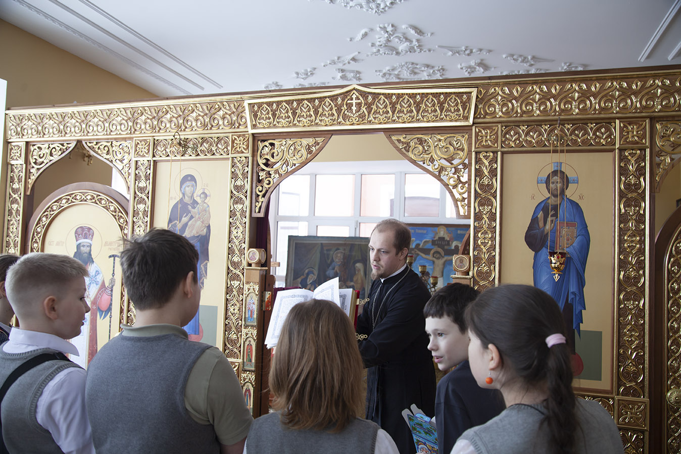 Отец Димитрий рассказал об особенностях учебного процесса в духовной школе, о предметах, которые изучают семинаристы. Дети познакомились с устройством православного храма и узнали когда читается в храме Евангелие.