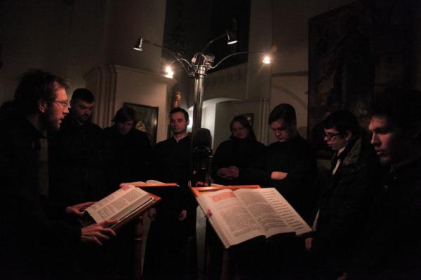 Семинаристы помогают священнослужителям в алтаре, поставляют службу и поют богослужебные песнопения. За вечерним богослужением 4 декабря регентовал хором воспитанников семинарии первый проректор иеромонах Сергий (Барабанов). Уставщик — Георгий Богачев