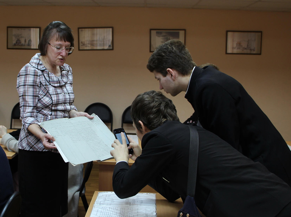 Знакомство с различными видами документов — указами, распоряжениями, классными журналами, творческими работами учащихся (конспектами, сочинениями, рисунками), позволило представить содержание учебного процесса и сравнить его с современными требованиями. Наряду с объяснениями, рассказом лектора, состоялась и беседа со слушателями.