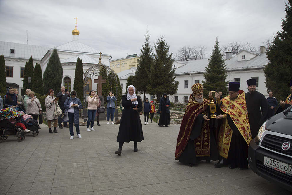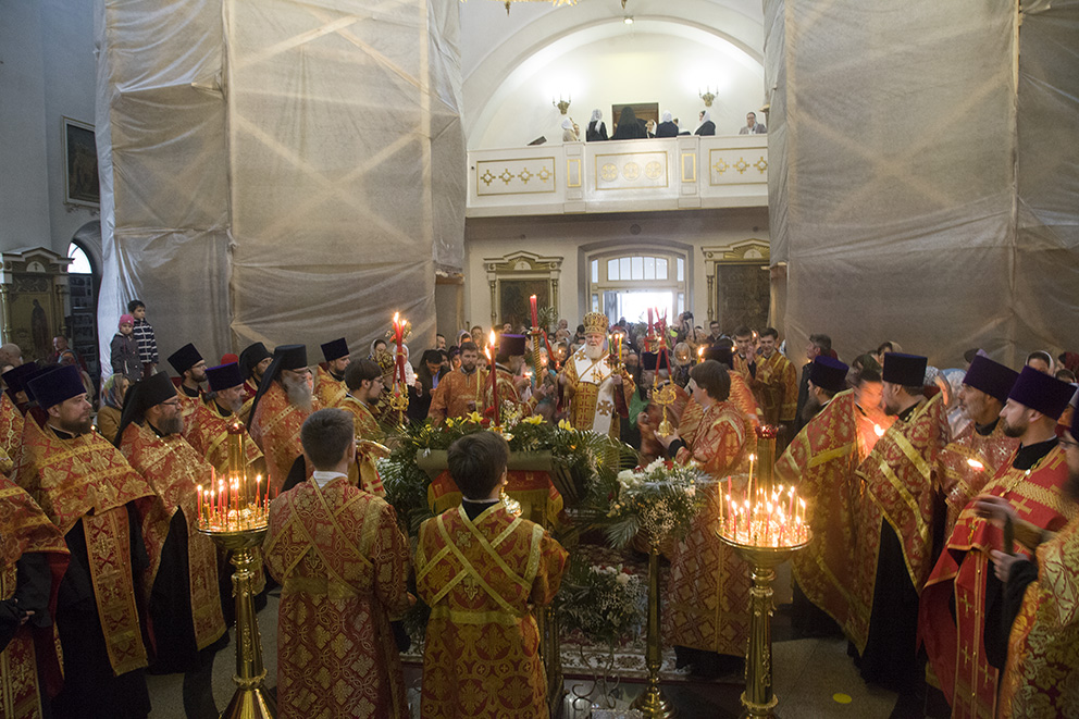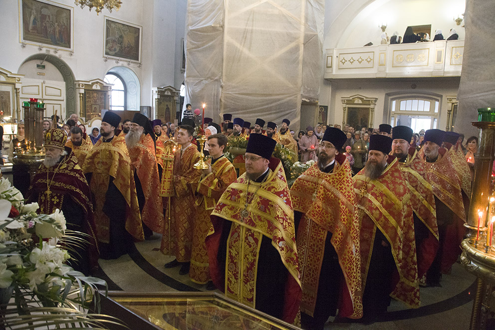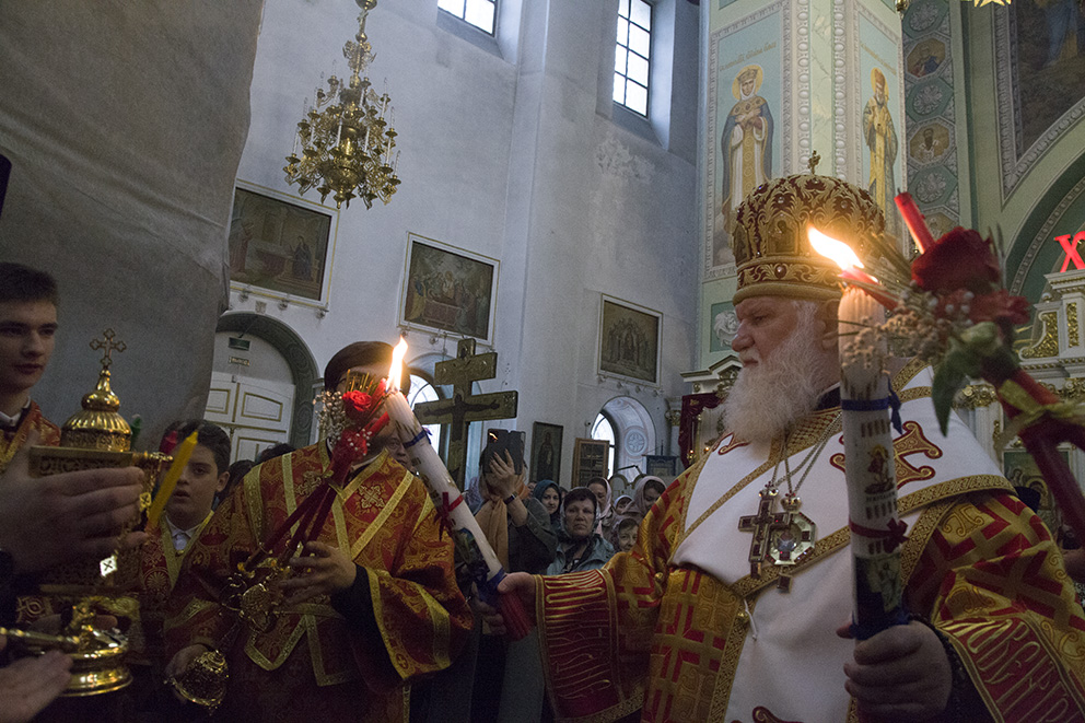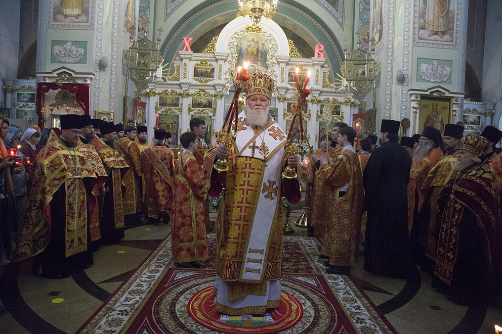 За полунощницей на середине храма перед Плащаницей был прочитан канон Великой Субботы. После 9-й песни канона Плащаницу занесли в алтарь и положили на престоле, где она будет находиться до отдания Пасхи. Затем начался Пасхальный крестный ход, во время которого под пение стихиры «Воскресение Твое, Христе Спасе….» вместе с владыкой священнослужители прошли вокруг Казанского храма обители.