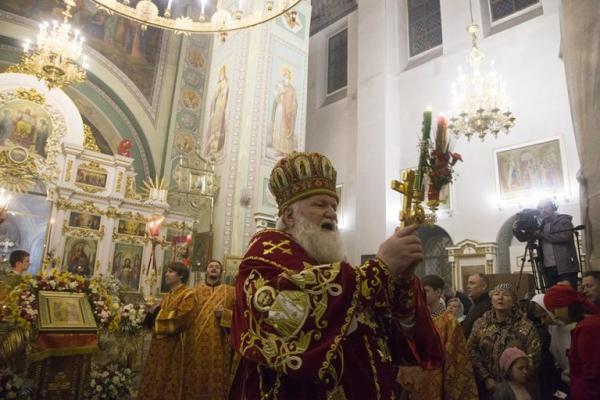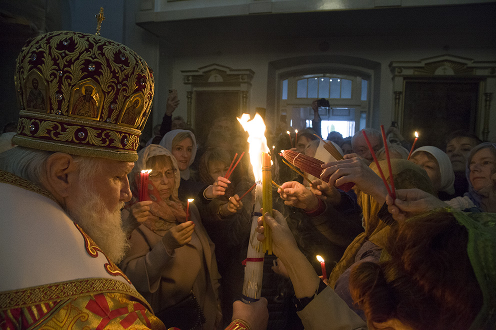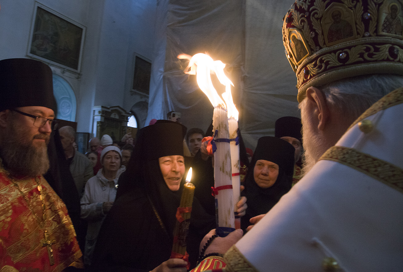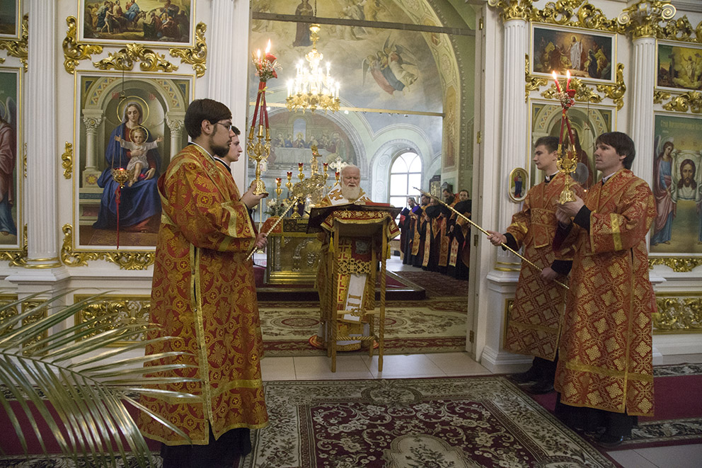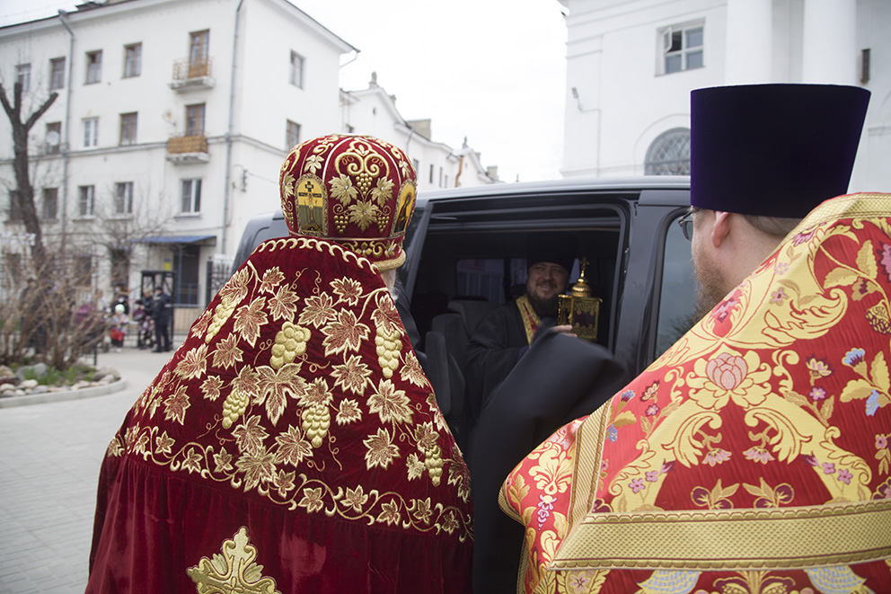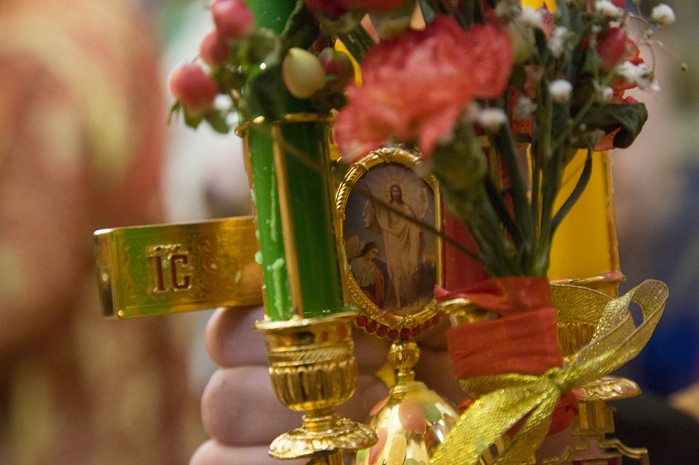 После запричастного стиха было прочитано Пасхальное послание Святейшего Патриарха Московского и всея Руси Кирилла. По заамвонной молитве владыка освятил артос – хлеб на закваске, который символизирует присутствие Иисуса Христа в нашей жизни. Традиция употреблять артос восходит к апостольскому времени.