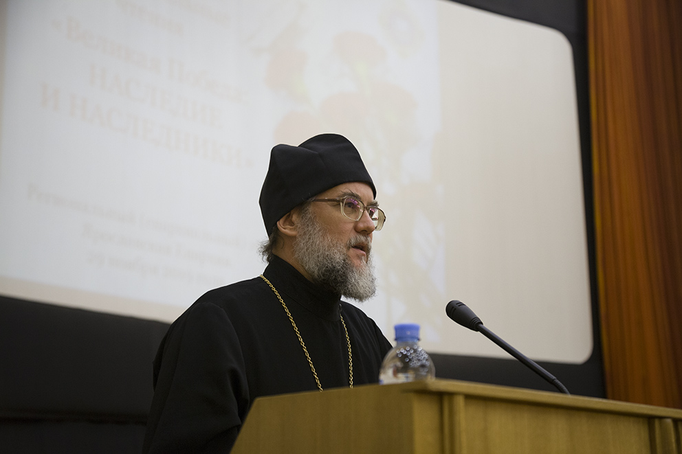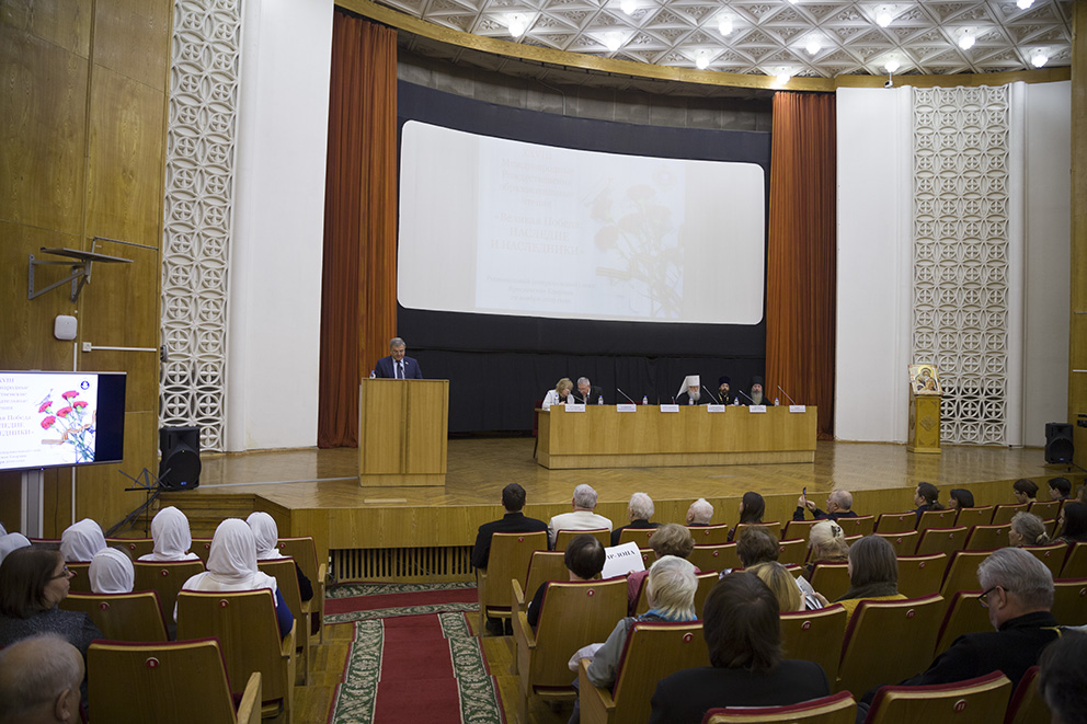 – Поздравляю всех участников чтений с началом работы Пленарного заседания. Наши образовательные чтения «Великая Победа: наследие и наследники» посвящены важной для всей страны дате, которая будет отмечаться в 2020 году – 75-летию Великой Победы в Великой Отечественной войне. Эта война была кровавой и столкнула между собой в вооруженном конфликте практически весь мир. По масштабам эту войну можно сравнить с катастрофой всемирного значения. Казалось бы, ничто не могло остановить это идеологическую и античеловеческую машину, называемую фашизмом. И, вспоминая то время, в первую очередь думается о тех людях, которые смогли на протяжении долгих пяти лет сопротивляться страшной силе разрушения. Что их поддерживало, что укрепляло и давало силы? Наш народ смог противостоять фашизму и выиграть в этой войне благодаря единству и любви к своей земле. Прошло 75 лет со дня победы в этой войне и до сих пор единство, патриотизм, а где и патриотизм, там и вера в Бога, являются образующими для жизни народа и государства в целом, а их потеря и разрушение несут самые тяжелые последствия.