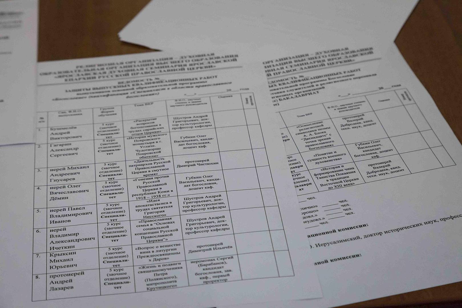 19 и 20 июня 2019 года в Ярославской духовной семинарии прошла защиты выпускных квалификационных работ студентами заочного отделения. Согласно регламенту защиты работ, студентам необходимо было предоставить законченную работу по выбранной тематике, сделать компьютерную презентацию, пройти защиту и ответить на вопросы комиссии. Все работы были в обязательном порядке проверены на заимствование материала в электронной системе «Антиплагиат».