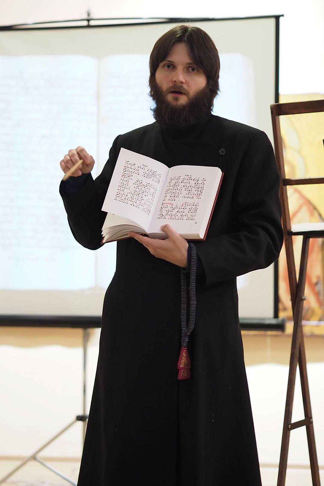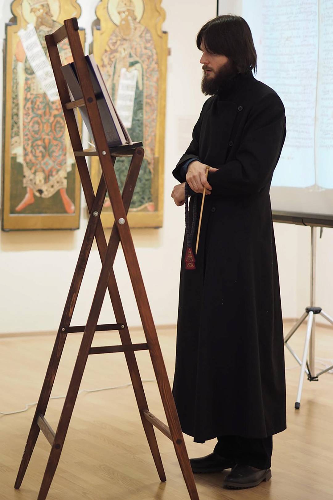 Также Иван Александрович продемонстрировал примеры чтения различных видов богослужебных текстов на погласицы (кратких, достаточно простых напевов, соответствующих строке текста и постоянно повторяющихся в процессе чтения), широко употребляющихся в древнерусском богослужении.