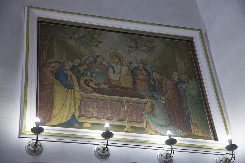 Тело же Ее апостолы решили похоронить в Гефсимании, где находился Гроб Господень и где погребены были родители Девы Марии и Ее нареченный супруг, праведный Иосиф. Сопровождая гроб, апостолы и другие жители Иерусалима несли светильники и пели псалмы. Иудейский священник Афоний, которого раздражало почитание Иисусовой Матери, толкнул гроб, желая перевернуть его,?— и тут же лишился кистей обеих рук: их отсек ангел, невидимо стоявший рядом. «Теперь ты видишь, что Христос истинный Бог»,?— сказал Афонию апостол Петр. Тот сразу покаялся — и руки срослись.