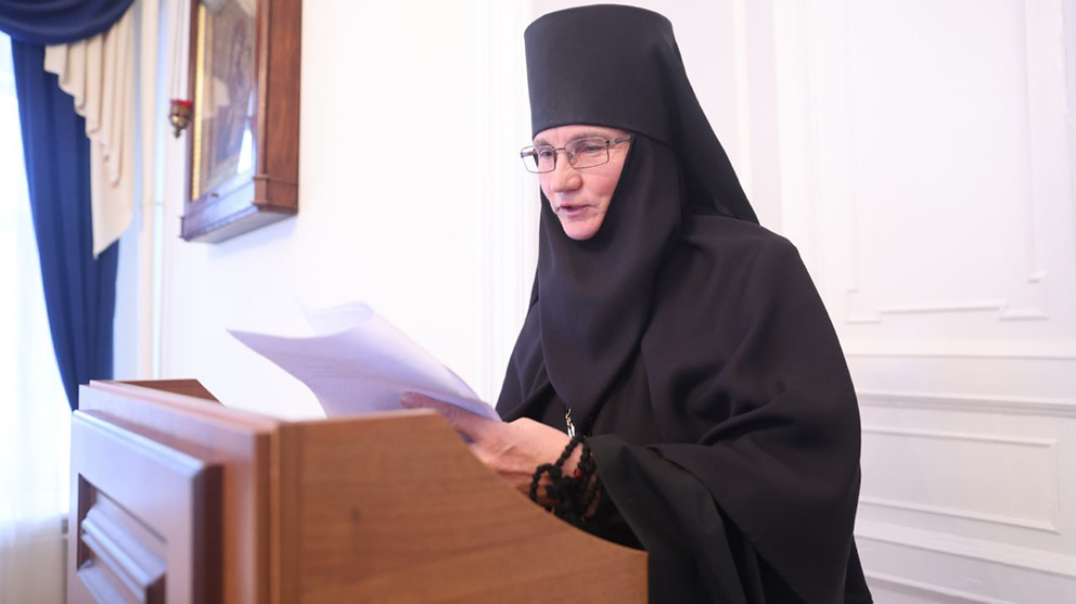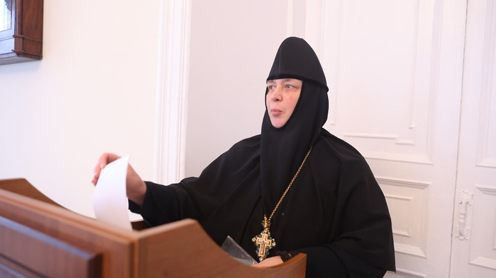 Доклад настоятельницы Свято-Введенского Толгского женского монастыря г.Ярославля игумении Варвары (Третьяк), который прочитала насельница Толгской обители монахиня Иринарха (Ворожцова), был посвящен старчеству, как плоду духовной культуры и особенностям подвига монашеской жизни на примере Оптинских старцев.