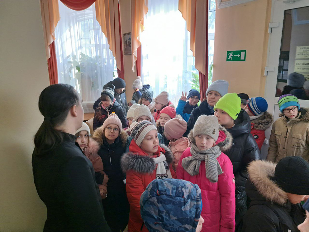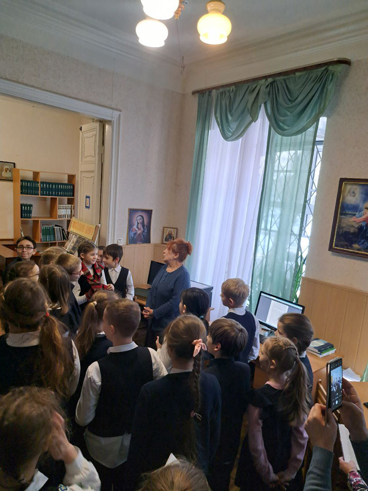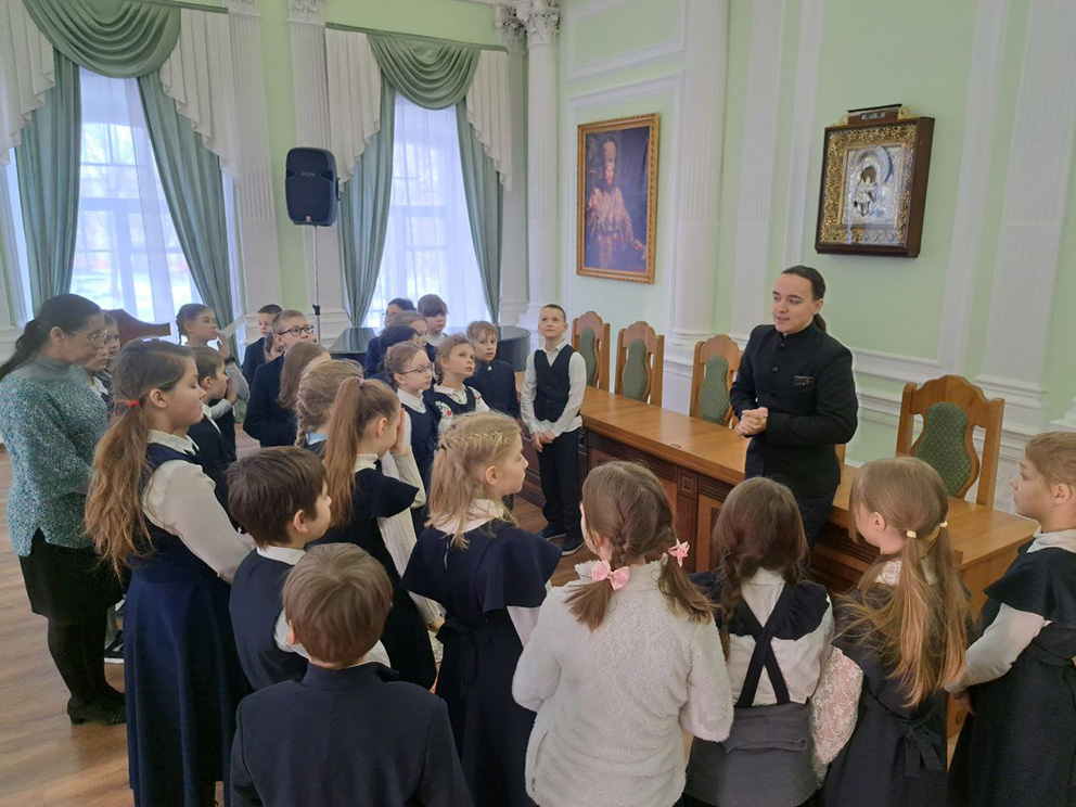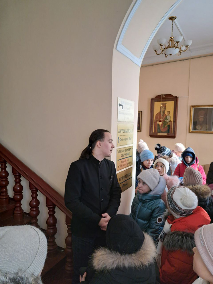 Ученикам рассказали историю основания духовной школы и историю здания, в котором в настоящее время располагается семинария. Семинаристы показали гостям сохранившуюся лепнину.