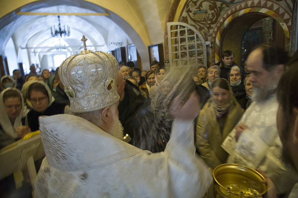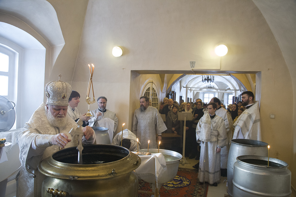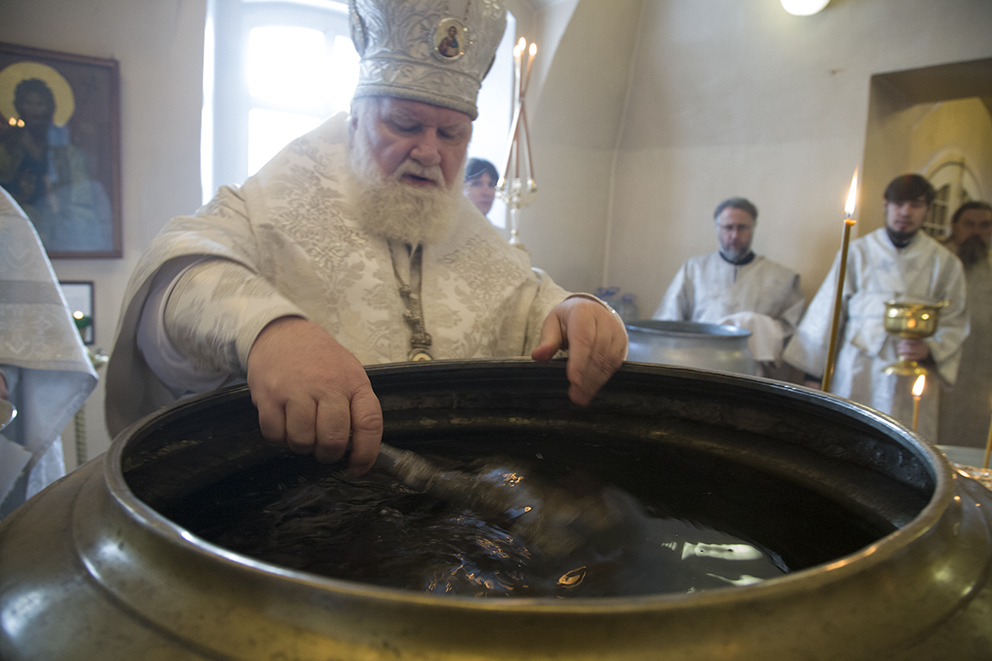После богослужения было совершено великое освящение воды. Эта вода называется Агиасмой, или Крещенской водой. Водоосвящение в Церкви под влиянием Иерусалимского устава происходит два раза – в Крещенский сочельник и в сам праздник Богоявления.