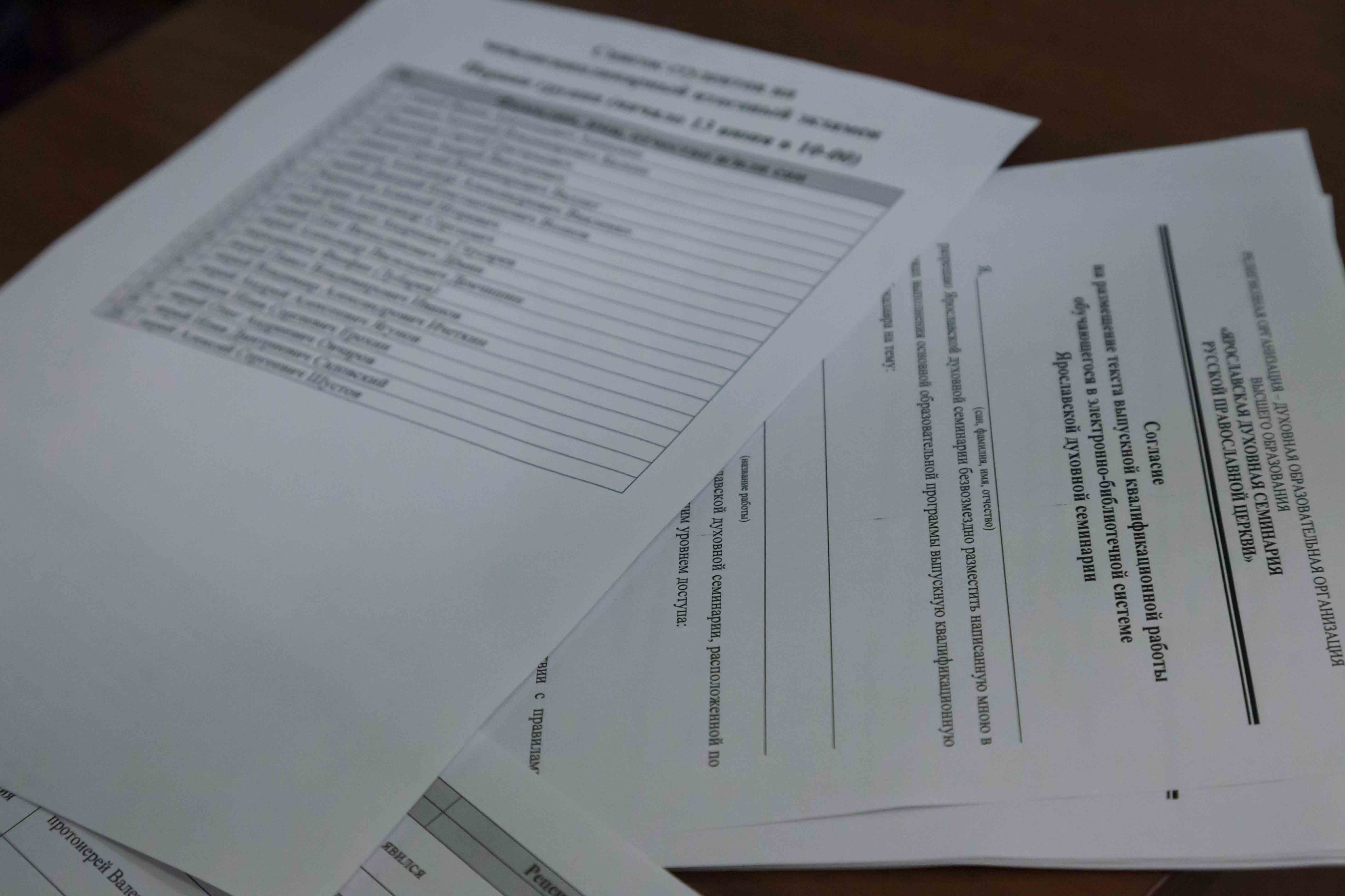 Экзамен принимали председатель Экзаменационной комиссии доктор исторических наук, профессор, преподаватель Ярославского государственного университета им. П. Г. Демидова Ю. Ю. Иерусалимский; заместитель председателя комиссии, первый проректор семинарии иеромонах Сергий (Барабанов); проректор по научной работе семинарии А. Г. Шустров; секретарь Ученого совета семинарии, заведующий кафедрой богословия и церковной истории протоирей Валерий Добродеев; заведующий сектором заочного обучения семинарии иеромонах Андрей (Кукушкин).