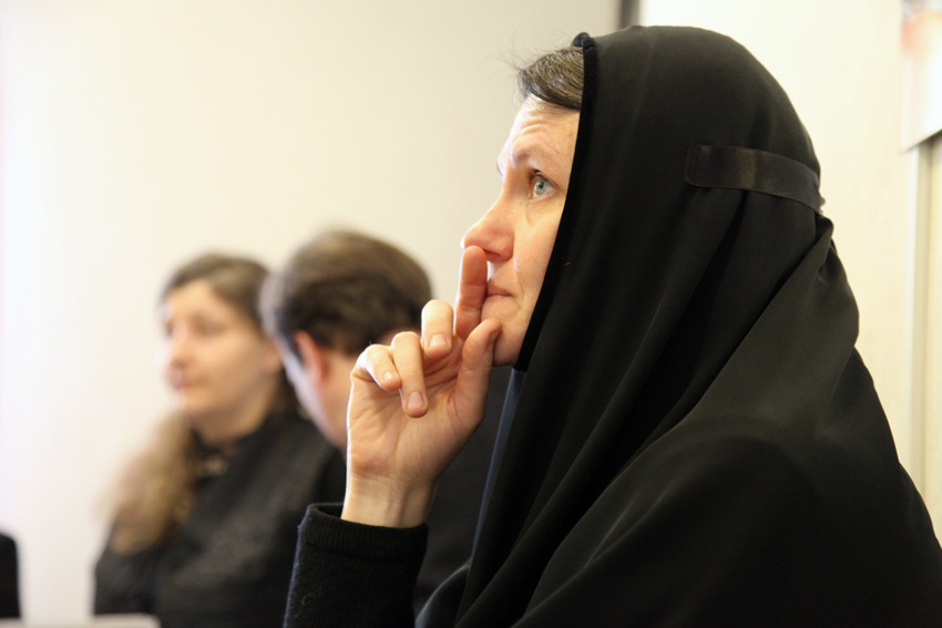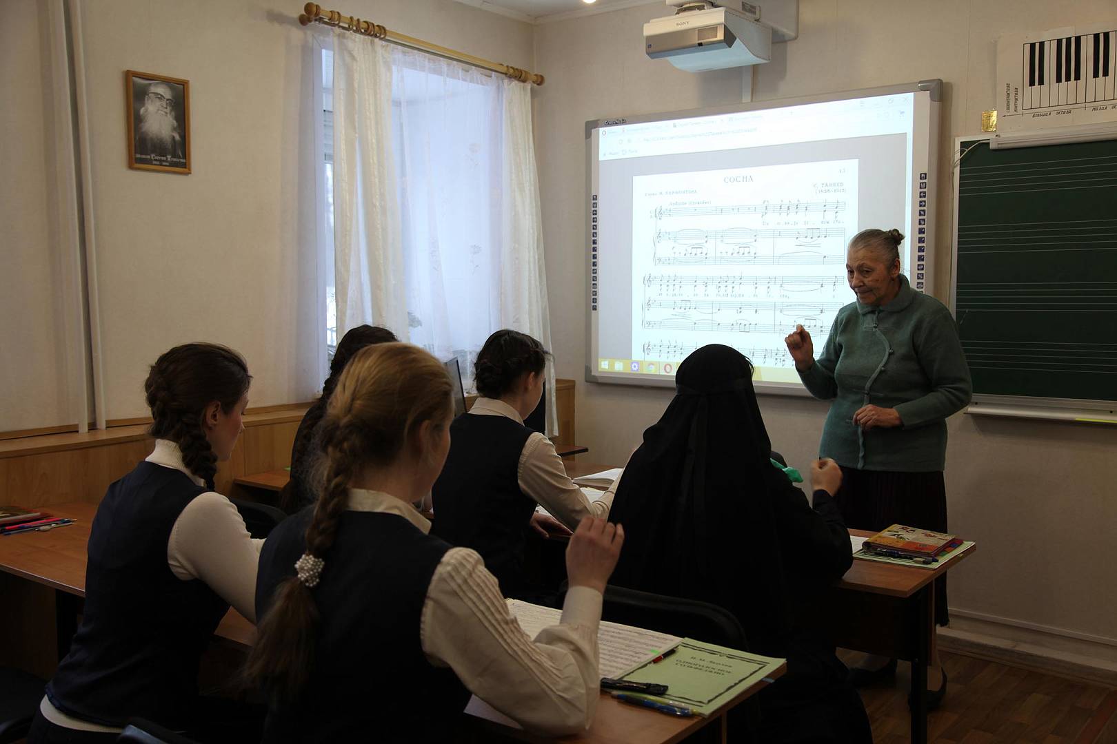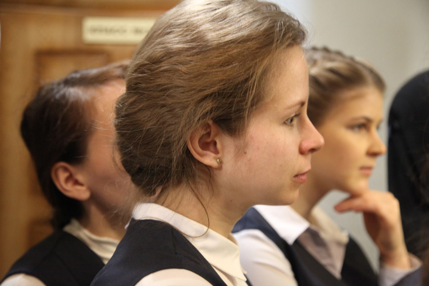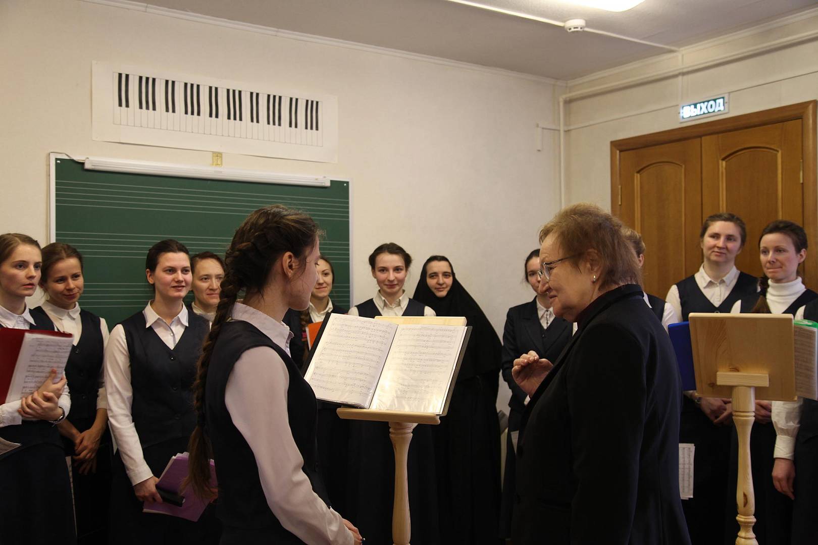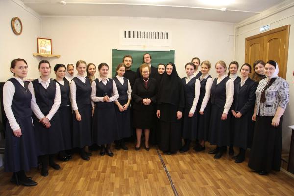 Открытый урок по «Сольфеджио» провела выпускница Ленинградской консерватории им. Римского-Корсакова Татьяна Васильевна Мирзакулова, преподающая в Регентской школе с момента ее основания. Всю жизнь Татьяна Васильевна проработала в музыкальном училище. Рассказывая о своем предмете, она отмечает, что Сольфеджио связано непосредственно со всеми другими предметами. «Музыкальный слух, – делится преподавательница, – должен быть организованным и грамотным. На третьем курсе Регентской школы программа довольно сложная. Воспитанницам нужно помимо диотоники обязательно знакомиться с хроматикой. Девочки должны понимать интонацию, иметь чувство строя».