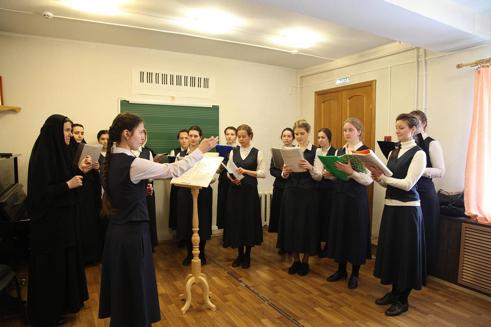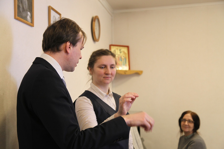 Урок по Дирижированию провела Жаворонкова Светлана Евгеньевна. Это было индивидуальное занятие, на котором свои навыки демонстрировала Михайлова Юлия, студентка 2 курса. О своем предмете рассказывает Светлана Евгеньевна: «На уроке мы учимся работать с хором, стараясь дать девочкам тот инструментарий, с которым он потом сможет организовать церковный хор. Девочки учатся выразительности и музыкальности, учатся раскрывать суть песнопения».