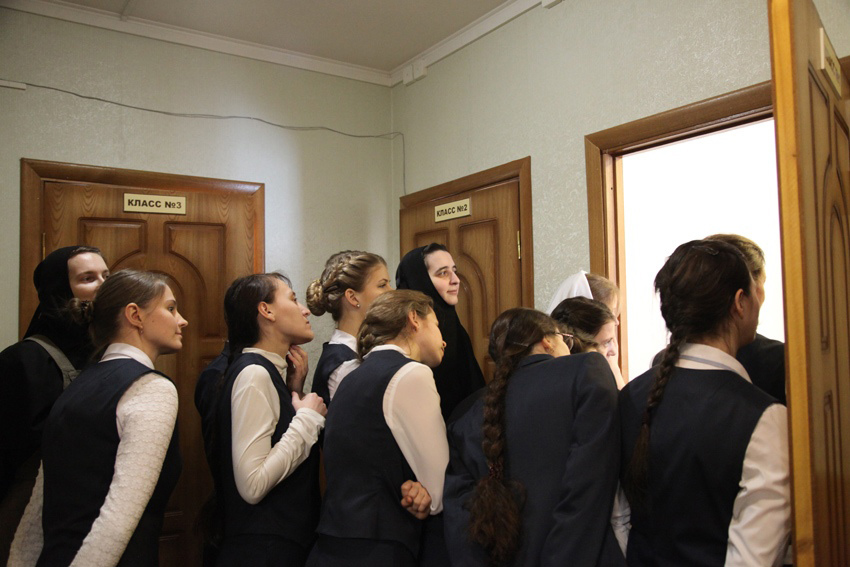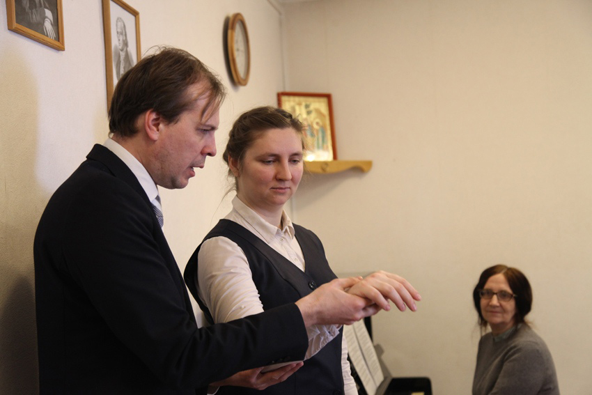 Урок по предмету «Постановка голоса» провела Саликова Елена Александровна. Она преподает в Регентской школе с момента ее основания. Вместе с тем, она является преподавателем в хоровой капелле «Ярославия». «Пение, – рассказывает Елена Александровна – это искусство. И очень важное значение в пении имеет дыхание. Мы добиваемся хорошей опоры дыхания, владения мышцами, поддержкой. Мы развиваем голос, работаем над его интонацией, потому что если нет интонации, не получится и само пение. Мы также работаем и в академической манере пения, учим мышечно формировать полость рта, опускать гортань, правильно артикулировать. Также мы работаем над пением во фразе, девочки учатся петь не по слогам, а вести фразу, чтобы она была живая».