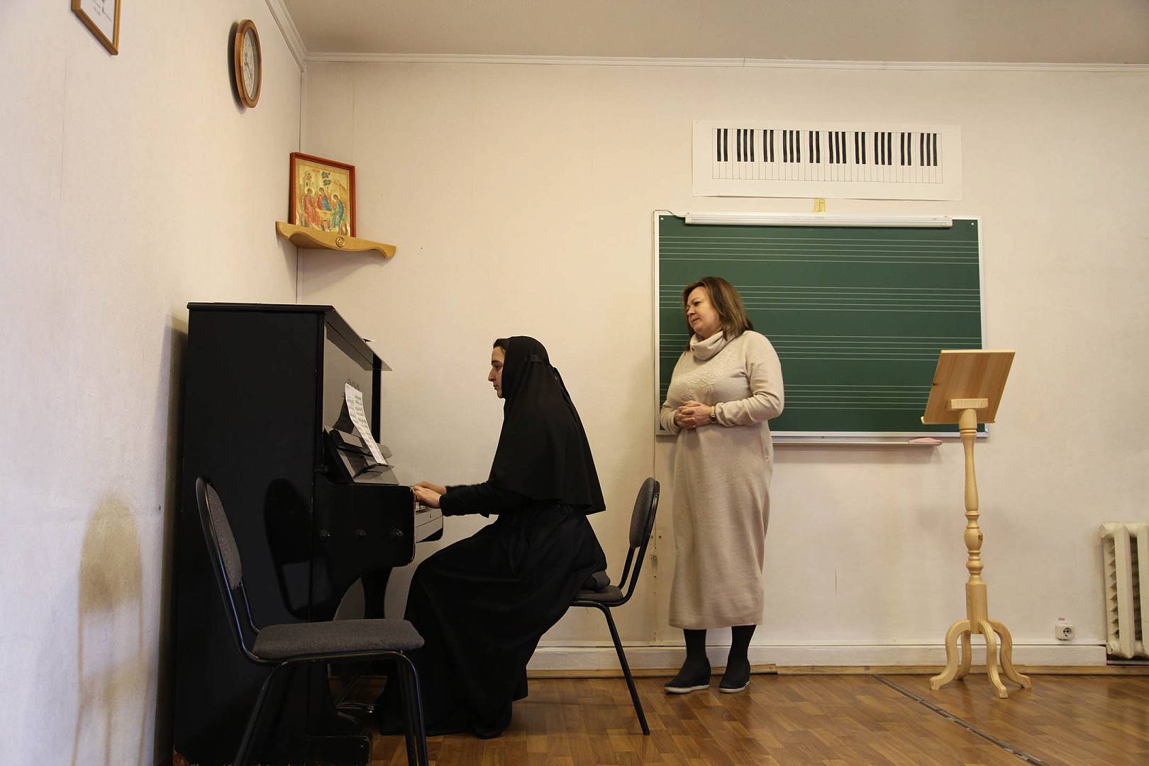 На уроке Фортепиано, который провела Алексеева Елена Алексеевна, свои навыки владения инструментом продемонстрировала студентка 3 курса инокиня Гавриила (Янковенко). «Индивидуальные занятия по фортепиана, – как отмечает Елена Алексеевна, – становятся помощью в дальнейшей работе регента с хоровыми партитурами. Во время занятий девочки работают над техникой, совершенствуются в игре на инструменте».