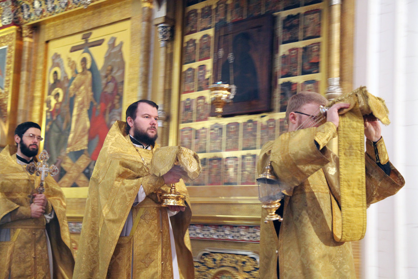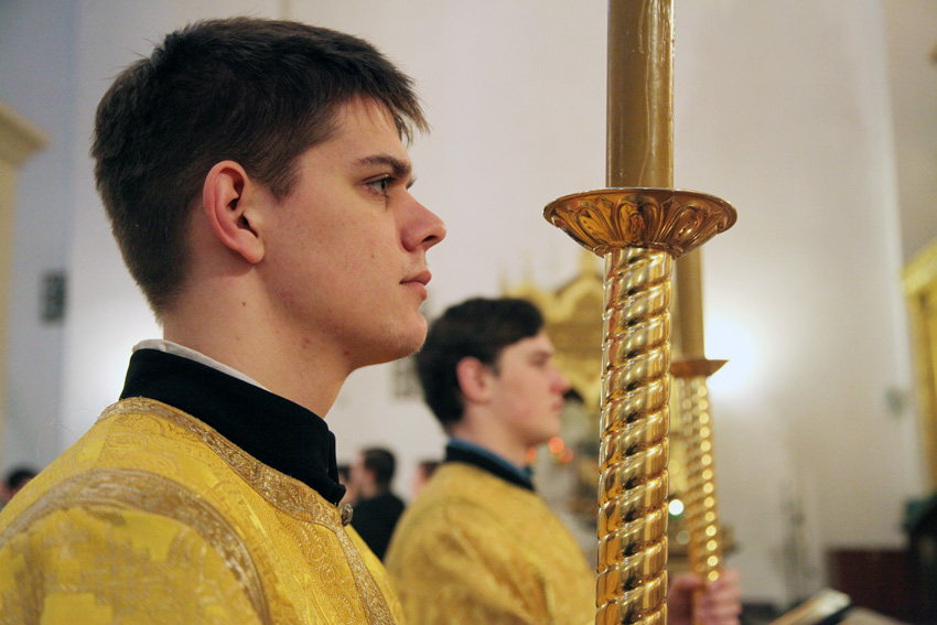 Сегодня Божественную литургию в соборе совершил преподаватель семинарии, ключарь собора иерей Дионисий Цыбуляк в сослужении клириков храма. За богослужением пел хор воспитанников семинарии под руководством первого проректора иеромонаха Сергия (Барабанова).