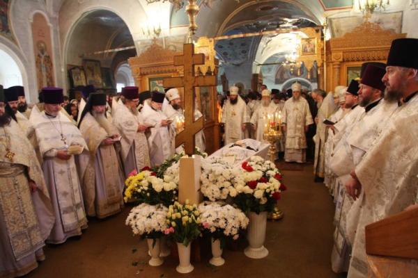 В храме за богослужением молились настоятельница Свято-Введенского Толгского женского монастыря игумения Варвара с сестрами обители, настоятельница Казанского женского монастыря г. Ярославля игумения Екатерина с сестрами, настоятельница Богоявленского Аврамиева монастыря г. Ростова Великого игумения Миропия с сестрами. Песнопения Литургии и чина отпевания исполнил хор воспитанников и преподавателей Ярославской духовной семинарии.