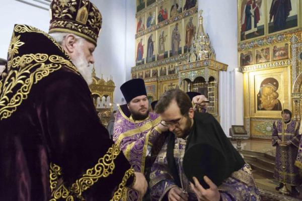 За богослужением во внимание к трудам на благо Святой Церкви благочинный приходов Центрального ярославского округа, настоятель храма Димитрия Солунского протоиерей Олег Косолапов и первый проректор Ярославской духовной семинарии, настоятель храма Спаса-на-Городу иеромонах Сергий (Барабанов) были удостоены наперсных крестов с украшениями.