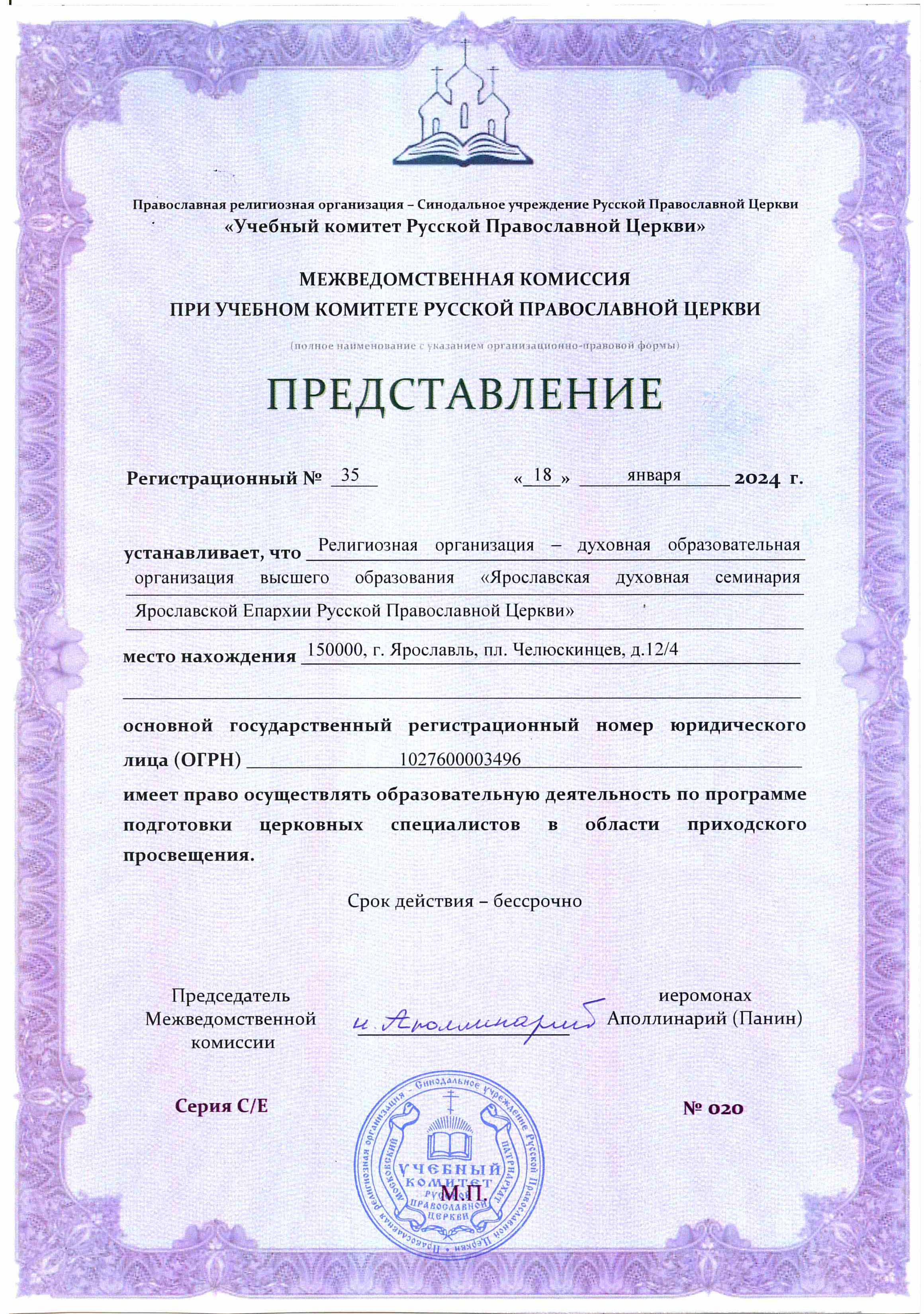 По результатам успешного освоения учебных программ, прохождения учебной практики и защиты выпускной квалификационной работы практической направленности будет выдан документ церковного образца, дающий право осуществлять катехизическую, миссионерскую, социальную и молодежную деятельность на приходах Ярославской митрополии.